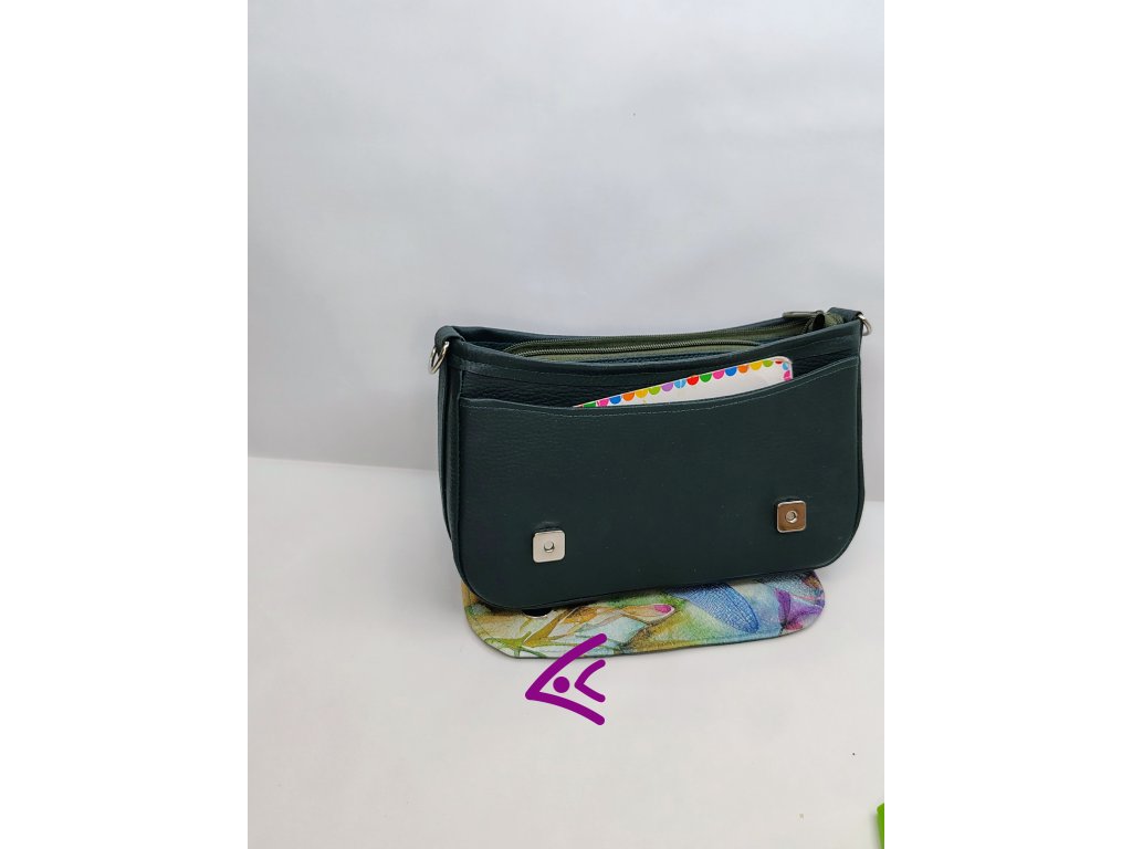 Ručně šitá kabelka z koženky v tmavě zelené barvě uvnitř s několika kapsami viz foto. Ušito pod značkou Tera handbag. velikostně se vejde A5.